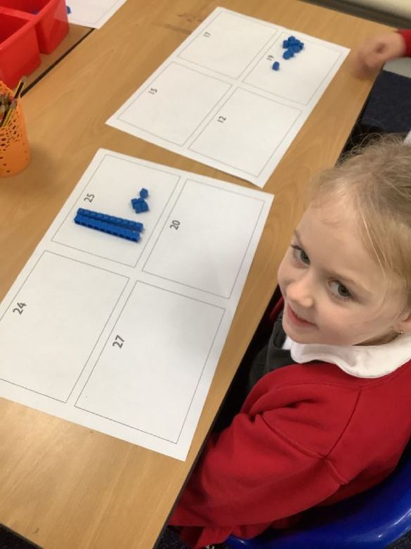 In maths we have been learning about place value of teen numbers. We are really good at knowing that 15 is made of 10 and 5 1s and 26 is 2 10s and 6 1s. We have been briliant number investigators and have been showing how to make numbers using different equipment such as numicon and dienes.